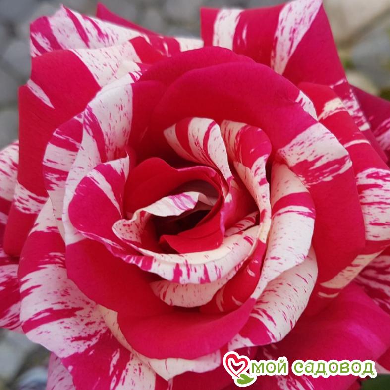 Чайно-гибридная роза с бутонами классической формы, которые раскрываются в крупные махровые малиново-красные цветки с белыми полосками, причем расположение этих полосок уникально для каждого цветка. Аромата практически нет. Цветение повторное. Куст крепкий, компактный, высотой около метра или чуть больше, компактный, со светло-зеленой листвой, устойчивой к заболеваниям.