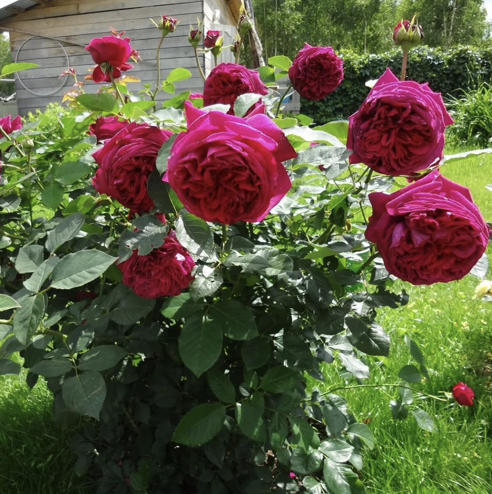 Роза Фальстаф (Falstaff, AUSverse) – результат кропотливой селекционной работы специалистов английского агрохолдинга Austin и, в частности, селекционера с мировым именем Д. Остина. Сорт был получен в результате генетического соединения роз флорибунда с винтажными и чайными гибридами. В 1999 году работы над усовершенствованием сорта были завершены, и новые саженцы поступили в оптово-розничную продажу. Мощное и крепкое растение состоит из прямых ветвей, высота которых находится в диапазоне от 120 см до 150 см. Диаметр кроны взрослого растения составляет 90 см. Все побеги розы обильно покрыты колючими наростами. Кустарник обильно усыпан крупными листовыми пластинами, окрашенными в насыщенно-зеленый оттенок с небольшим глянцевым блеском. Разветвленная корневая система имеет мощную структуру и уходит вглубь более чем на 2 метра, что позволяет растению получить максимальное количество влаги и питательных веществ. Диаметр цветов, которые по форме напоминающие чашу, часто достигает 12 см. Густомахровые бутоны состоят из 90-110 лепестков, которые плотно прилегают друг к другу. На одном стебле может сформироваться до 5 бутонов Особое внимание необходимо уделить цветовой гамме соцветий. Базовый оттенок лепестков темно-малиновый, однако в зависимости от освещенности участка лепестки могут стать фиолетовыми, бордовыми и даже черными. Цвет внешних лепестков гораздо насыщеннее, чем оттенок внутренней части. Начинающих садоводов обязательно удивит и аромат розы, который имеет насыщенную, густую и пьянящую структуру, способную проникнуть в каждый уголок сада и наполнить его нотками розового масла.